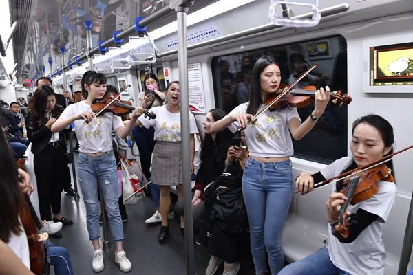 人群之中幾位音樂愛好者慢慢聚集在一起,合著悠揚(yáng)的曲調(diào),歌聲在車廂里傳遞。歡樂美好的氣氛同樣吸引了車廂內(nèi)的市民駐足觀看并參與其中,大家紛紛拿起手機(jī)拍下精彩的瞬間。