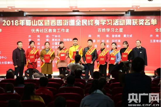 央廣網(wǎng)合肥12月29日消息 2018年12月21日下午,蜀山區(qū)暨西園街道全民終身學(xué)習(xí)活動周開幕式在合肥市科技館舉行。開幕式上對本年度的區(qū)級“百姓學(xué)習(xí)之星”“全民終身學(xué)習(xí)體驗點”“優(yōu)秀社區(qū)教育工作者”“優(yōu)秀社區(qū)教育活動品牌”進行了表彰。西園街道“老少同樂共度好時光”等6個品牌為優(yōu)秀社區(qū)教育活動品牌;琥珀街道陶偉等12名同志為優(yōu)秀社區(qū)教育工作者;五里墩街道夏玉進等6名同志為“百姓學(xué)習(xí)之星”;井崗鎮(zhèn)“十里書香城市閱讀空間”、五里墩街道家家景園社區(qū)“微課堂”被評為“全民終身學(xué)習(xí)體驗點”。