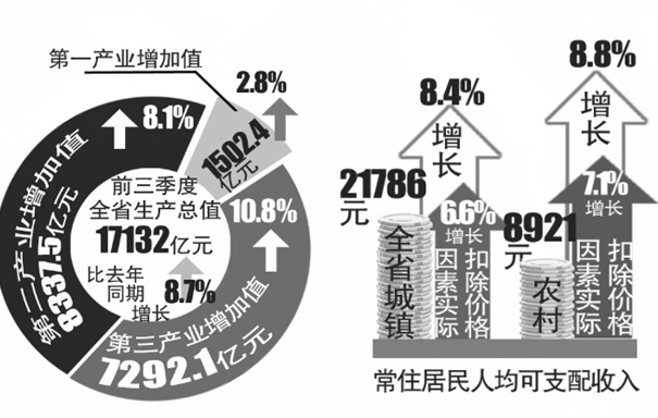 作為拉動(dòng)經(jīng)濟(jì)增長(zhǎng)的主導(dǎo)力量,前三季度,全省規(guī)模以上工業(yè)實(shí)現(xiàn)增加值7192.7億元,增長(zhǎng)8.6%,增幅比全國(guó)高2.6個(gè)百分點(diǎn),居全國(guó)第6、中部第2位。分行業(yè)看,汽車增幅最大,為25.3%;家用洗衣機(jī)和彩電增速超過10%。前三季度,全省固定資產(chǎn)投資19706.5億元,增長(zhǎng)11.5%,增幅與上半年持平,比全國(guó)高3.3個(gè)百分點(diǎn)。和上半年相比,房地產(chǎn)投資熱度稍減,但銷售持續(xù)火爆,去庫(kù)存效果顯著。 9月末,商品房待售面積2426.9萬(wàn)平方米,比6月末減少136.4萬(wàn)平方米。
