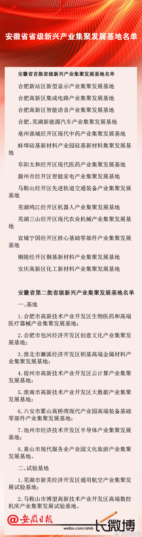 安徽全力推進(jìn)省級(jí)戰(zhàn)略性新興產(chǎn)業(yè)集聚發(fā)展基地建設(shè)。2015年,安徽省政府確定了第一批省級(jí)戰(zhàn)略性新興產(chǎn)業(yè)集聚發(fā)展基地,合肥新站區(qū)新型顯示產(chǎn)業(yè)集聚發(fā)展基地等14家入圍。2016年,省政府確定第二批10家戰(zhàn)略性新興產(chǎn)業(yè)集聚發(fā)展基地,其中基地有8家,試驗(yàn)基地有2家。目前,安徽省戰(zhàn)略性新興產(chǎn)業(yè)集聚發(fā)展基地共有24家。