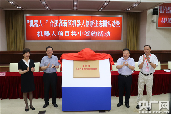 安徽省委常委、合肥市委書記宋國(guó)權(quán),安徽省經(jīng)信委主任牛弩韜,合肥市長(zhǎng)凌云,中國(guó)機(jī)器人產(chǎn)業(yè)聯(lián)盟執(zhí)行理事長(zhǎng)兼秘書長(zhǎng)宋曉剛見(jiàn)證簽約儀式,并為“安徽省機(jī)器人集成應(yīng)用創(chuàng)新基地”揭牌。
