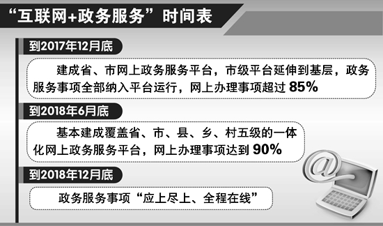 規(guī)劃明確了推進(jìn)“互聯(lián)網(wǎng)+政務(wù)服務(wù)”的“時(shí)間表”。到2017年12月底,建成省、市網(wǎng)上政務(wù)服務(wù)平臺(tái),市級(jí)平臺(tái)延伸到基層,政務(wù)服務(wù)事項(xiàng)全部納入平臺(tái)運(yùn)行,網(wǎng)上辦理事項(xiàng)超過85%,在全省基本實(shí)現(xiàn)群眾和企業(yè)辦事“最多跑一次”,努力做到本級(jí)公共服務(wù)事項(xiàng)1個(gè)工作日、企業(yè)開辦3個(gè)工作日、不動(dòng)產(chǎn)登記證5個(gè)工作日、工業(yè)建設(shè)項(xiàng)目施工許可證50個(gè)工作日內(nèi)完成審批手續(xù)。到2018年6月底,完成全省政務(wù)服務(wù)事項(xiàng)標(biāo)準(zhǔn)化,基本建成覆蓋省、市、縣、鄉(xiāng)、村五級(jí)的一體化網(wǎng)上政務(wù)服務(wù)平臺(tái),網(wǎng)上辦理事項(xiàng)達(dá)到90%。到2018年12月底,政務(wù)服務(wù)事項(xiàng)“應(yīng)上盡上、全程在線”,實(shí)行跨部門、跨層級(jí)、跨區(qū)域業(yè)務(wù)協(xié)同辦理。