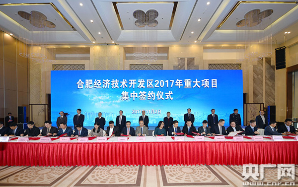 央廣網(wǎng)合肥11月2日消息(記者徐鵬 通訊員章玉龍 李長(zhǎng)龍)11月2日上午,合肥經(jīng)開區(qū)舉行2017年重大項(xiàng)目集中簽約暨集中開工儀式,53個(gè)重點(diǎn)項(xiàng)目集中簽約、集中開工,涵蓋家電、汽車、電子信息、現(xiàn)代服務(wù)業(yè)等產(chǎn)業(yè),總投資697.79億元。