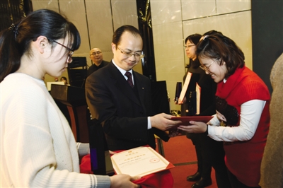 原中國新聞出版總署副署長、中國期刊協(xié)會會長石峰為成都市委宣傳部常務(wù)副部長、文明辦主任張映明頒獎(jiǎng)。
