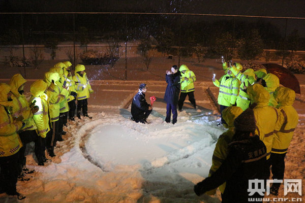 1月25日晚19時(shí)許,一名員工把魯亞萍“騙”到現(xiàn)場(chǎng),面對(duì)此情此景和單膝下跪遞上“鮮花”的小查,小魯感動(dòng)地?zé)釡I盈眶。兩人在風(fēng)雪中相擁,眾人舉起手機(jī)拍下視頻和照片為他們歡呼喝彩。隨后,眾人將視頻和照片轉(zhuǎn)發(fā)至中心微信群,贏得了更多的祝福與點(diǎn)贊。簡(jiǎn)短的儀式后,全員又重新回到緊張的鏟冰除雪工作中。