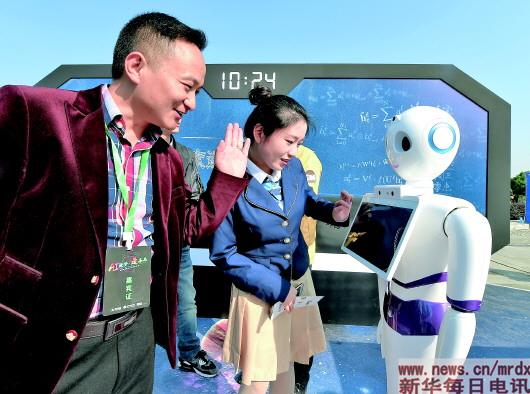 在安徽合肥開幕的科大訊飛(首屆)全球1024開發(fā)者節(jié)展示區(qū)內(nèi),參觀者和智能語音機器人進(jìn)行互動(2017年10月24日攝)。 新華社資料片
