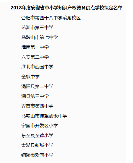這15所中小學(xué)入選安徽知識產(chǎn)權(quán)教育試點學(xué)校(名單)