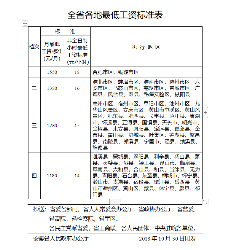 央廣網(wǎng)合肥11月1日消息(記者王利)經(jīng)安徽省人民政府同意,安徽自今天起調(diào)整全省最低工資標(biāo)準(zhǔn)。調(diào)整后,月最低工資標(biāo)準(zhǔn)四個檔次分別調(diào)整至:1550元、1380元、1280元、1180元。非全日制用工小時最低工資標(biāo)準(zhǔn)同步調(diào)整,分別為:18元、16元、15元、14元。這是安徽省建立最低工資標(biāo)準(zhǔn)制度以來,第13次調(diào)整最低工資標(biāo)準(zhǔn)。