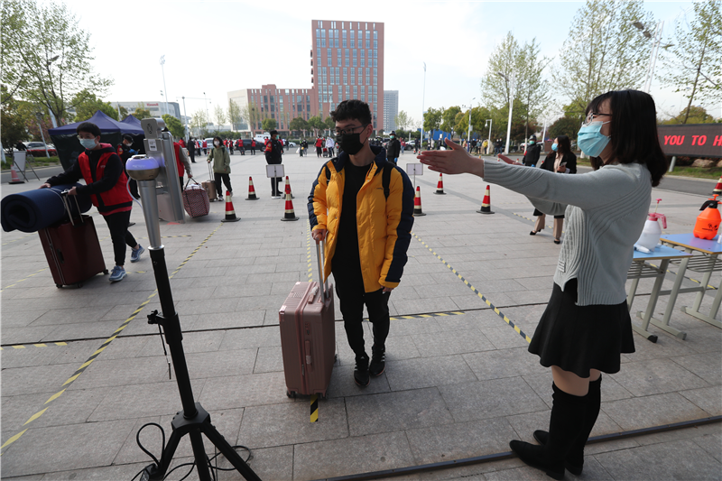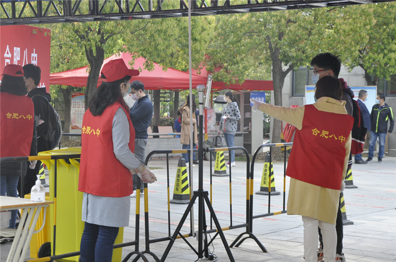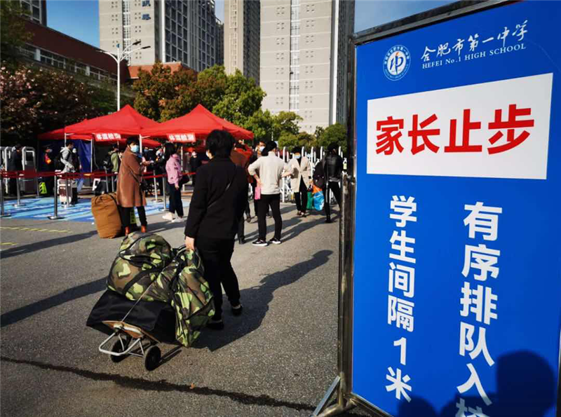 4月7日是高三年級(jí)返校首日, 在合肥一中教學(xué)區(qū)的西大門(mén)設(shè)置了六條學(xué)生返校通道。為避免人群聚集,還設(shè)置了家長(zhǎng)等候區(qū),家長(zhǎng)不可以入校。學(xué)生在進(jìn)入班級(jí)之前也要由班主任進(jìn)行體溫檢測(cè)正常后進(jìn)入班級(jí)。