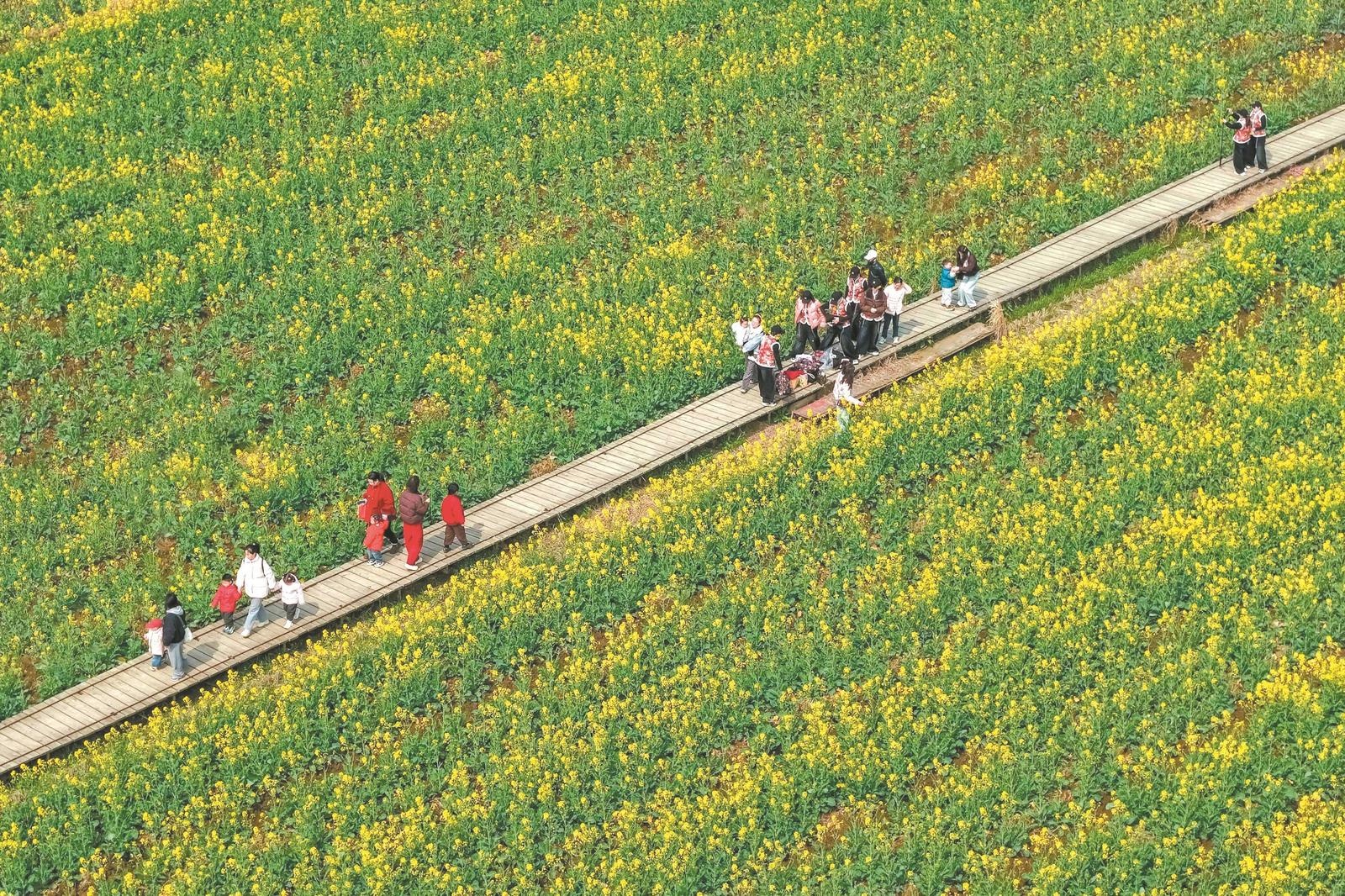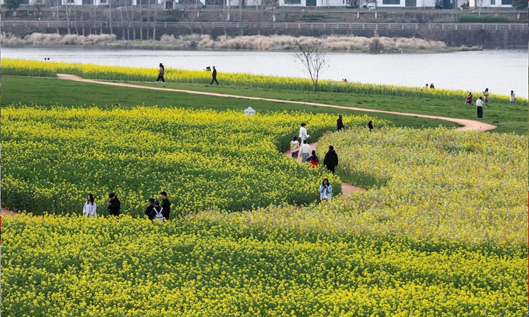 3月7日,銅陵市銅官區(qū)西湖鎮(zhèn)橫塘鄉(xiāng)村生態(tài)園里的油菜花爭相綻放,市民和游客在金黃的花田里踏青賞花,感受大好春光。