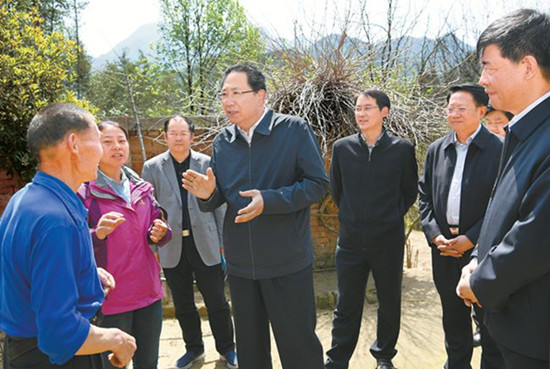 4月13日,省委書記李錦斌來到金寨縣花石鄉(xiāng)大灣村,與貧困戶陳澤申親切交談,細(xì)算脫貧賬,并祝賀他即將喜遷新居。吳文兵攝
