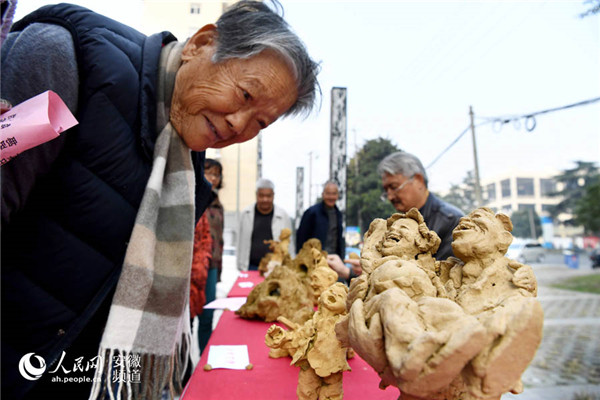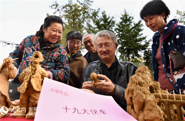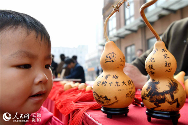 近日,在合肥市瑤海區(qū)和平路街道當(dāng)涂路社區(qū)居民文化廣場,居民群眾在欣賞以“黨的十九大精神”為主題的葫蘆烙畫、泥塑、鐵字等非遺手工技藝現(xiàn)場制作及作品展示。