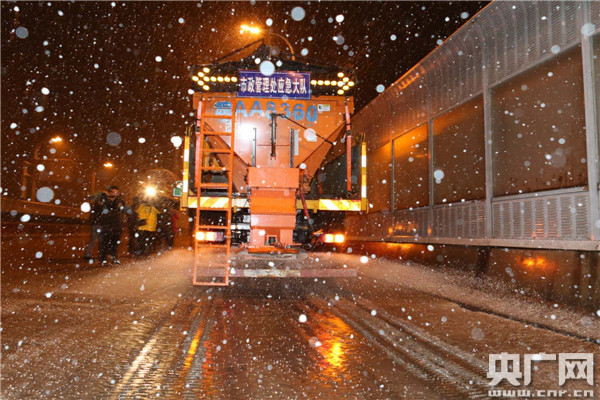 央廣網(wǎng)合肥1月4日消息(記者劉軍 通訊員殷。1月3日至6日,合肥市迎來今冬首場(chǎng)降雪,且達(dá)到暴雪級(jí)別。為保障全市高架橋、立交橋等市管橋梁及重點(diǎn)路段、重點(diǎn)區(qū)域在暴雪天氣下的安全暢通,合肥市城鄉(xiāng)建委市政處3日上午及時(shí)啟動(dòng)應(yīng)急響應(yīng),112臺(tái)套綜合除雪應(yīng)急設(shè)備及500余名應(yīng)急隊(duì)員迅速在五里墩立交橋、阜陽北路等6個(gè)市政應(yīng)急點(diǎn)完成集結(jié)。根據(jù)雪情,合肥市市政處不間斷循環(huán)作業(yè),至1月4日7時(shí),經(jīng)過一晝夜的奮戰(zhàn),合肥市九座高架橋及市管重點(diǎn)橋梁通行正常。