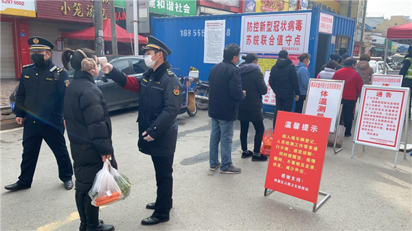 馬鞍山市博望區(qū)丹陽農(nóng)貿(mào)市場作為皖蘇兩省丹陽南北兩鎮(zhèn)唯一的農(nóng)貿(mào)市場,每天跨省購物的人流量較大,人員群體復(fù)雜。為了有效防控疫情,江寧區(qū)和博望區(qū)兩地城管開展聯(lián)動合作,在兩省交界處丹陽農(nóng)貿(mào)市場門口設(shè)置蘇皖兩省聯(lián)合疫情防控點(diǎn)。