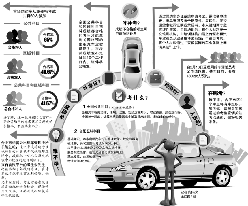 據(jù)安徽商報報道 昨日上午,合肥市首場網(wǎng)絡(luò)預(yù)約出租汽車駕駛員從業(yè)資格考試在合肥軍英(八一)駕校舉行,考試共分為全國公共和合肥區(qū)域兩個科目,每個科目滿分均為100分,及格分各為80分。當(dāng)天60人考試,只有25人通過考試,合格率41.67%。據(jù)了解,考試成績發(fā)布之日起10個工作日內(nèi),合肥市運(yùn)管部門會為成績合格的考生核發(fā)《網(wǎng)絡(luò)預(yù)約出租汽車駕駛員證》。沒有通過考試的考生可以申請預(yù)約補(bǔ)考。接下來,合肥市區(qū)9個考點(diǎn)將組織開展考試。