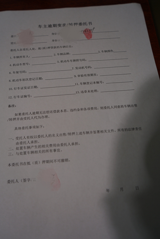 名目繁多的合同和委托書為進(jìn)一步套牢客戶,客戶在簽訂合同時(shí),除了提交身份證、行駛證、車輛購置稅發(fā)票復(fù)印件等材料,還要簽訂以及提交還款說明書、車輛抵押借貸合同、委托書、承諾書和聲明(聲明后果自負(fù))、客戶熟人名單(方便日后催款)、車輛質(zhì)押借款合同(為拖車做準(zhǔn)備的,如果客戶違約,公司就會(huì)進(jìn)入質(zhì)押環(huán)節(jié))等等多項(xiàng)材料。