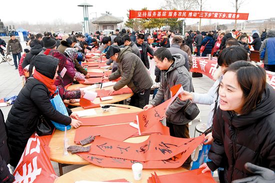 1月24日,淮南市文化科技衛(wèi)生“三下鄉(xiāng)”集中示范活動(dòng)在壽縣舉行,該市文化、科技、衛(wèi)生等部門結(jié)合職能開展為民服務(wù),助力精準(zhǔn)扶貧。(圖為淮南市書法家現(xiàn)場(chǎng)為壽縣農(nóng)民寫春聯(lián)。特約攝影陳彬)