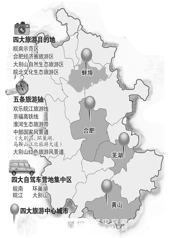 率先啟動建設(shè)合肥、黃山、蕪湖市三大自駕游中心城市;以皖南、環(huán)巢湖、皖江、大別山為重點發(fā)展區(qū)域,兼顧皖北、皖中地區(qū)發(fā)展需求,建設(shè)150個自駕車(房車)營地、露營地,形成皖南、環(huán)巢湖、皖江、大別山等四大自駕車營地集中區(qū);建設(shè)大別山自駕車風(fēng)景道、皖南自駕車風(fēng)景道、環(huán)巢湖自駕車風(fēng)景道;建設(shè)20個自駕車綜合服務(wù)中心和500個自駕車服務(wù)驛站。