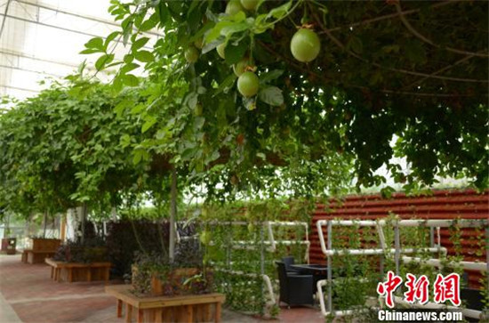 在產(chǎn)業(yè)園一旁,是對外展示的光伏農(nóng)業(yè)智能溫室大棚,郁郁蔥蔥的各類植物,是占地面積300畝的大棚內(nèi)的主角,大棚里小橋流水,曲徑通幽,各種植物高低錯落,甚至還有來自熱帶的椰子樹、仙人掌等。