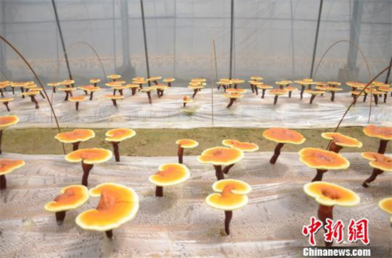 在光伏支架的下方,是用黑色的布簾圍住的靈芝大棚,里面整齊地種植著一排排金黃色的靈芝。再過幾十天,這些靈芝就能產(chǎn)生效益。