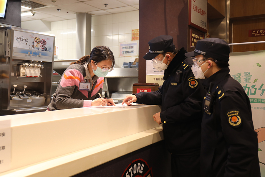 張獻(xiàn)輝,就是其中一名連續(xù)奮戰(zhàn)多天的城管隊(duì)員。記者跟隨他來到站內(nèi)的一家肯德基餐廳。進(jìn)門后,張獻(xiàn)輝查看了餐廳的營(yíng)業(yè)執(zhí)照并進(jìn)行了記錄,隨后檢查了餐廳員工健康登記情況和公共區(qū)域的消毒情況,并詢問餐廳是否有返京員工,是否按要求隔離。他提示餐廳負(fù)責(zé)人,一定要提高重視,落實(shí)餐廳管控主體責(zé)任,顧客來購(gòu)買餐品時(shí)排隊(duì)要保持距離,堂食顧客要保持用餐距離,現(xiàn)在是非常時(shí)期,餐廚垃圾更要妥善處置,日產(chǎn)日清。