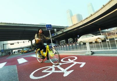 昨天下午,市民在國貿(mào)橋下剛剛鋪設(shè)完成的彩色自行車道內(nèi)騎行。目前,三環(huán)輔路慢行系統(tǒng)整治工作已接近尾聲,全線4.8萬平方米的彩色自行車道及標(biāo)識牌全部鋪裝完成。本報(bào)記者