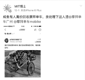 原標(biāo)題:網(wǎng)上回收共享單車開(kāi)價(jià)2000元