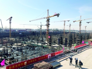 探訪當(dāng)日,北京晨報記者走過一條長長的甬道來到臨邊防護(hù)圍欄前,60萬平方米的超大體量施工現(xiàn)場著實令人震撼。13臺塔吊在施工現(xiàn)場不同部位不停揮動著長臂,完成著一次次超大跨度的運輸?shù)跹b。綠色的運輸卡車正在川流不息地進(jìn)行著土方回填,一片井井有條的繁忙景象。據(jù)現(xiàn)場工作人員介紹,目前,地下結(jié)構(gòu)施工已臨近尾聲,預(yù)計5月底前全部完成。