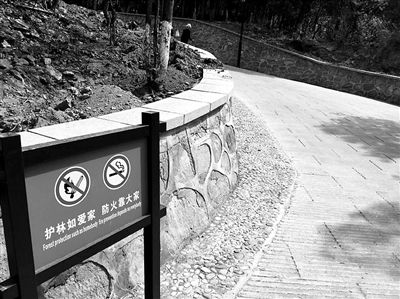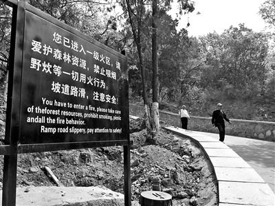 北青報(bào)記者探訪發(fā)現(xiàn),從八大處公園大門通往證果寺約2公里的范圍內(nèi),至少有5塊指示牌存在英文翻譯錯(cuò)誤。其中,在距離證果寺約800米的地方,有一塊長約2米的大型指示牌,提醒人們注意防火,這塊大型指示牌上的文字為“您已進(jìn)入一級火區(qū),請愛護(hù)森林資源,禁止吸煙、野炊等一切用火行為。坡道路滑,注意安全!”這段36個(gè)漢字組成的指示語下面,同樣配有英文翻譯。
