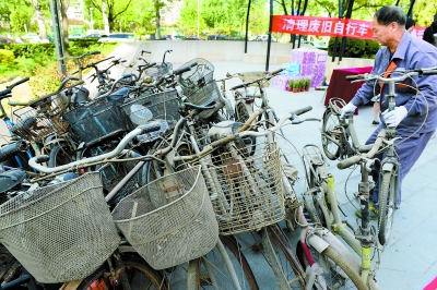 “吉慶里的冬青叢邊就停著幾輛自行車,不知道多少年沒(méi)人碰過(guò)了!背饨值老嚓P(guān)負(fù)責(zé)人說(shuō),在老舊小區(qū),不論是墻根下,還是車棚里,都能找到“僵尸自行車”的身影。它們有的落滿塵埃、銹跡斑斑,有的輪胎發(fā)癟開裂,甚至“缺胳膊少腿”,擠占了大量公共空間。為了清僵尸車給共享單車騰地兒,一個(gè)月前,吉慶里社區(qū)在每輛自行車的把手上系了一根紅繩,如果紅繩被摘除,就說(shuō)明車子有主人,反之,則由社區(qū)、街道統(tǒng)一回收、清走。此外,居民自家的閑置自行車也能送到社區(qū),兌換盆栽、綠植。