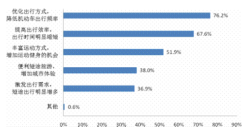 76.2%的被訪居民認(rèn)為共享單車優(yōu)化了出行方式,降低了機(jī)動(dòng)車出行頻率;67.6%的被訪居民認(rèn)為提高了出行效率,出行時(shí)間明顯縮短;51.9%的被訪居民認(rèn)為豐富了運(yùn)動(dòng)方式,增加了運(yùn)動(dòng)健身的機(jī)會(huì)。