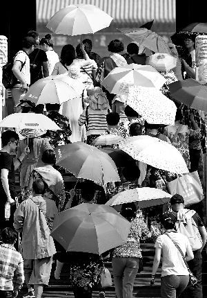 昨天,故宮博物院內(nèi),游客使出各種防曬高招兒。有的打著傘猛喝水,有的用報(bào)紙頂頭上,也有的干脆在樹蔭底下躺地上短歇。北京晨報(bào)記者 柴春霞/攝