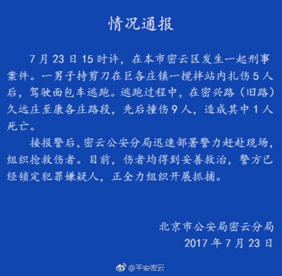 人民網北京7月24日電 北京市公安局密云分局官方微博23日晚通報一起刑事案件,一男子持剪刀扎傷5人后逃跑,并在駕車逃跑過程中撞傷9人,其中1人死亡。目前,警方已鎖定犯罪嫌疑人,正全力組織開展抓捕。