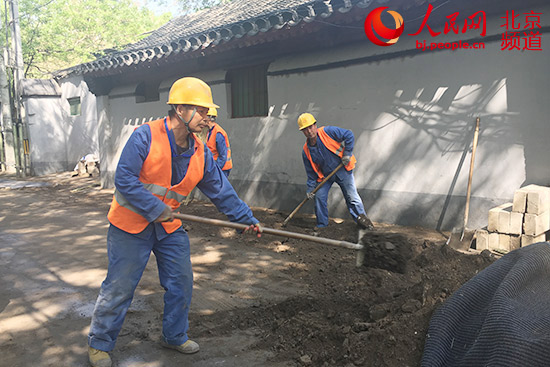 金融街街道西斜街42號院門前,十幾名工人正在挖溝鋪設(shè)弱電線纜管道。人民網(wǎng) 鮑聰穎 攝
