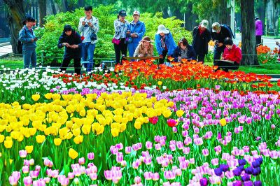 “五一”假日,游人來到中山公園,觀賞郁金香、洋水仙、葡萄風(fēng)信子等95個品種30余萬株世界名花。本報記者 鄧偉攝