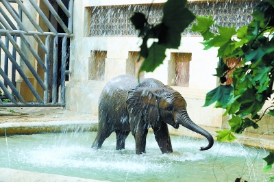目前動(dòng)物運(yùn)動(dòng)場(chǎng)的噴淋設(shè)備基本達(dá)到全覆蓋,全天不少于兩次噴淋作業(yè),以增強(qiáng)動(dòng)物的體表舒適度。高溫炎熱時(shí)飼養(yǎng)員還會(huì)用水管對(duì)大熊貓、大象、犀牛、北極熊等進(jìn)行人工沖涼。動(dòng)物園還在犀牛運(yùn)動(dòng)場(chǎng)設(shè)置了泥浴池,在大熊貓館、大象館運(yùn)動(dòng)場(chǎng)建造了戲水池,讓動(dòng)物體驗(yàn)“水上樂園”的樂趣。