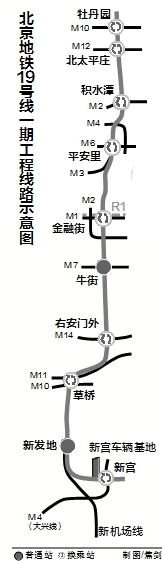 地鐵19號線分兩期建設,一期由豐臺新宮至海淀牡丹園,全長約22.4公里。全線設10座車站,其中8座為換乘站,分別為新宮(大興線)、新發(fā)地、草橋(新機場線、M10、M11)、右安門外(M14)、牛街、金融街(M1、M2、R1)、平安里(M6、M3、M4)、積水潭(M2)、北太平莊(M12)、牡丹園(M10)。