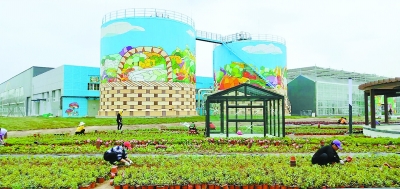 百蔬園外還有一處亮眼的景觀,兩個以蔬菜籃為設計元素的巨型彩繪能源罐高聳矗立。這兩個為溫室大棚提供能源的能源罐,經(jīng)過中央美院專家團隊的藝術設計和現(xiàn)場手繪后,呈現(xiàn)出藍天白云下蔬菜籃子的幾何圖案,充分體現(xiàn)了百蔬園的藝術特性。