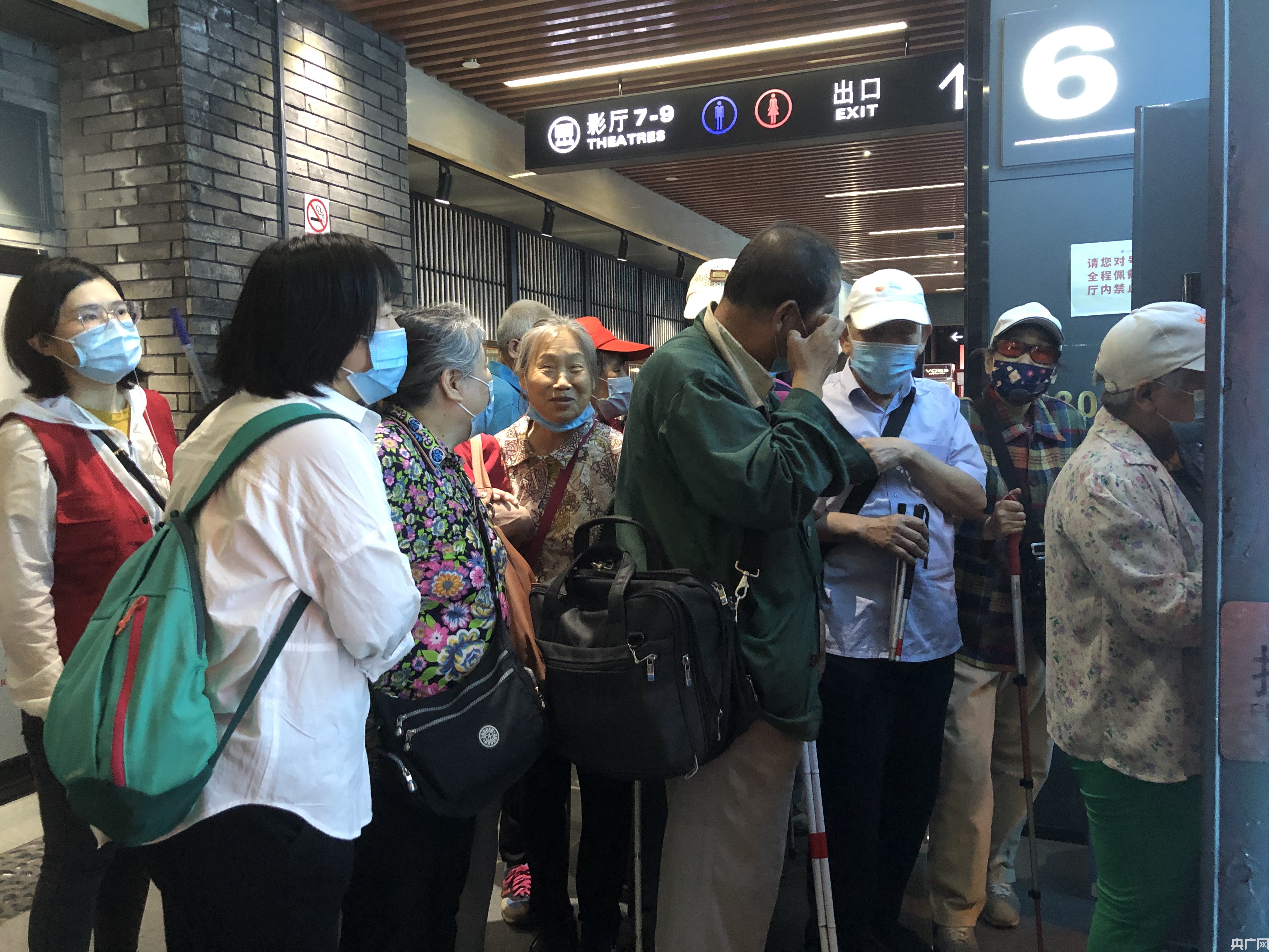 活動(dòng)開始前,外研社志愿者按時(shí)就位,接視障觀眾到達(dá)影院。