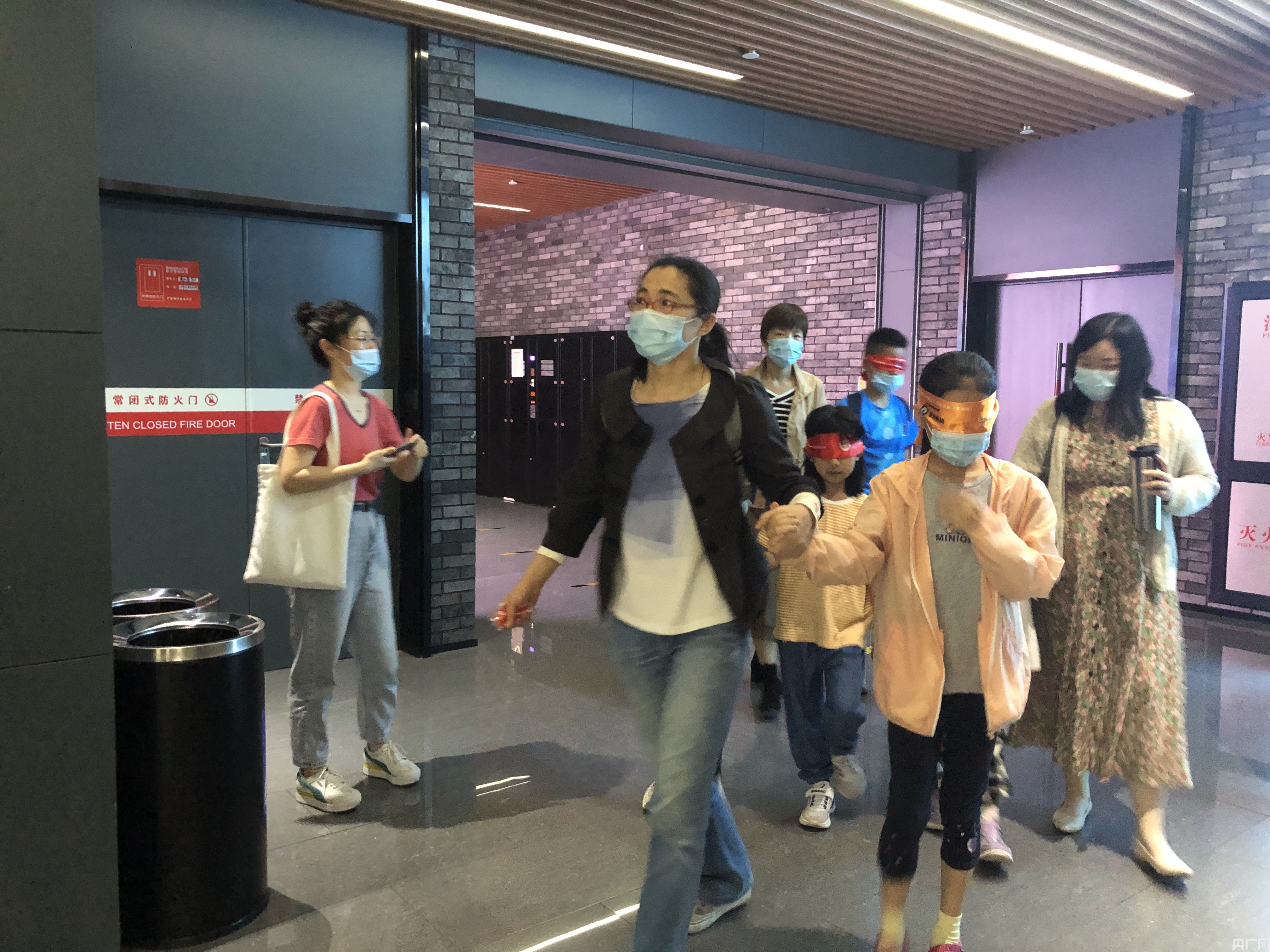 參與人員到場后,志愿者引領(lǐng)觀眾進(jìn)入影廳,學(xué)生們系上絲巾,體驗(yàn)蒙眼行走,感受不一樣的世界。