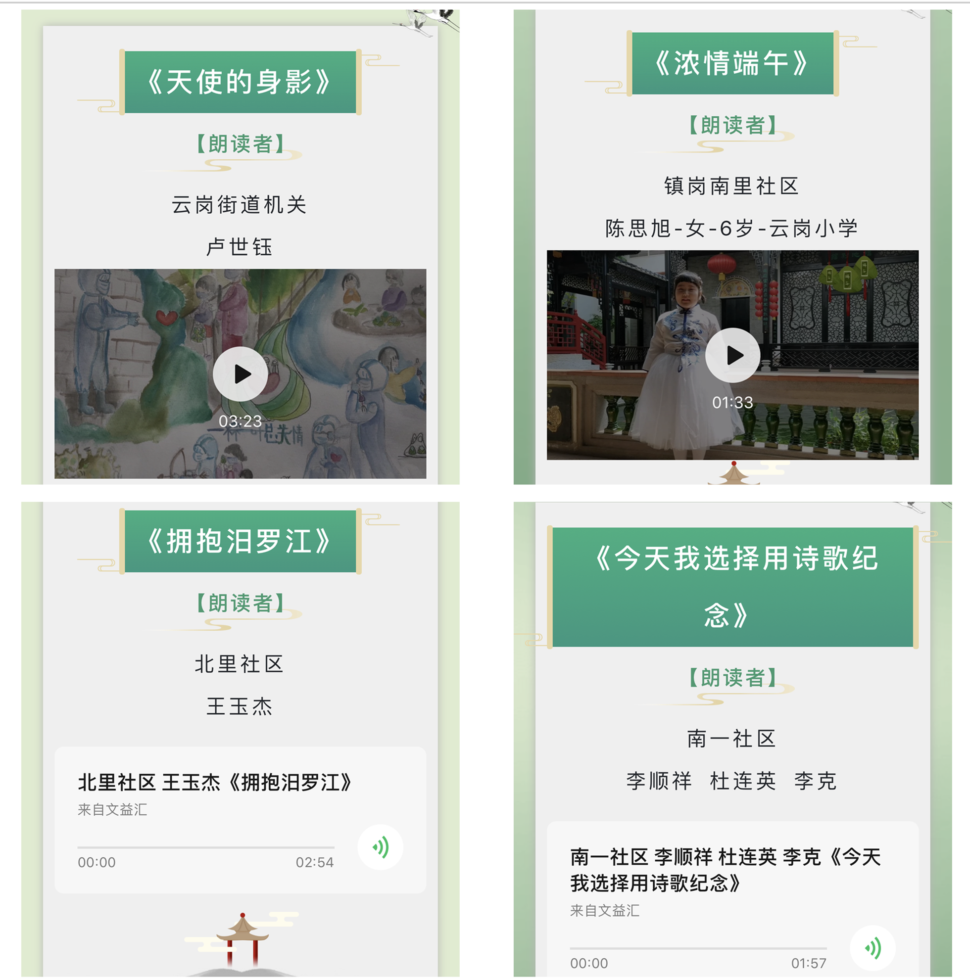 “往年端午節(jié),都是在線下以各種形式舉辦活動,弘揚(yáng)家國情懷、感受中華優(yōu)秀傳統(tǒng)文化、寄托美好愿望。疫情期間,為防止人流密集、保證居民身體健康,目前還不能開展聚集性活動,通過‘互聯(lián)網(wǎng)+文化’的形式,讓轄區(qū)居民朋友們匯聚‘云端’,在感受傳統(tǒng)文化魅力的同時,學(xué)習(xí)防疫知識,用聲音、用畫筆為抗疫加油鼓勁!”云崗街道辦事處社區(qū)建設(shè)辦公室副主任李明輝說。