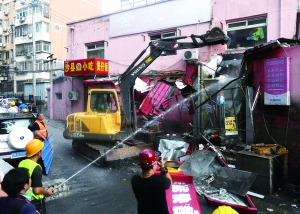 東城城管龍?zhí)秷?zhí)法隊副隊長趙巖說,這片違建建于上世紀(jì)80年代,距離旁邊的鐵路線只有40米。隨著大型機(jī)器的鐵臂下去,酥脆的墻面迅速倒下,露出房頂內(nèi)部破舊的電線!坝械姆孔臃宽斁褪撬芰吓菽褰ǔ傻模由纤嚼娋,具有非常大的安全隱患!