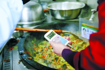 星級食堂到底長啥樣?記者上午做了探訪,換上食堂專用工作服、戴上鞋套、佩戴口罩,走進食堂,一側(cè)便是醒目的食堂員工儀容儀表標準規(guī)范:頭發(fā)不外露、請戴口罩、手沒有傷口、不留長指甲、不抹指甲油、不佩戴戒指、肩上無落發(fā)、不戴耳環(huán)……深入食堂,主食初加工區(qū)、細加工區(qū)、熱加工區(qū)、消毒庫、洗碗間、主食加工區(qū)、備餐間各個空間劃分井井有條。記者注意到,食堂將清洗區(qū)域做了細致的分工,雞蛋、肉類、魚類分池清洗;抹布也是各司其職,衛(wèi)生專用、死角專用、切配間操作專用毛巾用不同顏色區(qū)分。臨近午餐時間,廚師長拿出了一個細細的探頭,探頭一側(cè)連有溫度顯示屏,細細消毒后,廚師長將探頭插入鍋內(nèi)正在翻炒的筍片炒肉中,“66.6攝氏度,溫度不夠,還要再加溫!睆N師長解釋說,按照相關(guān)要求,肉菜出鍋溫度應(yīng)達到90攝氏度,半葷菜需要達到80攝氏度,素菜出鍋時也要達到70攝氏度,“一方面是為了衛(wèi)生,一方面也是為了讓孩子吃的時候飯還熱乎。”