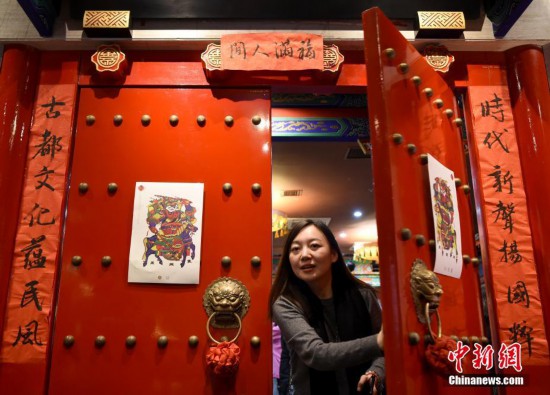 1月27日,由文化和旅游部恭王府博物館和中國文化傳媒集團(tuán)主辦的“年畫重回春節(jié)”系列活動在北京老舍茶館拉開序幕,圖為一名市民走出活動現(xiàn)場。中新社記者 侯宇 攝