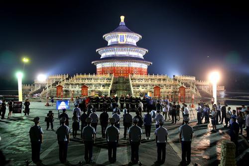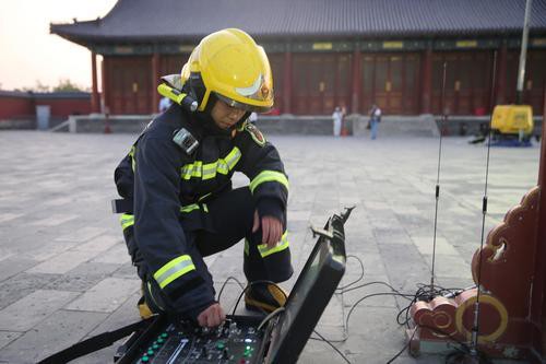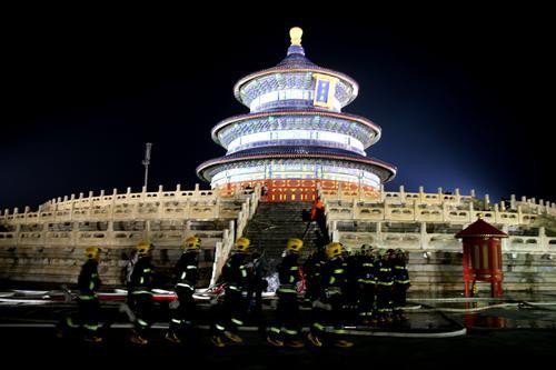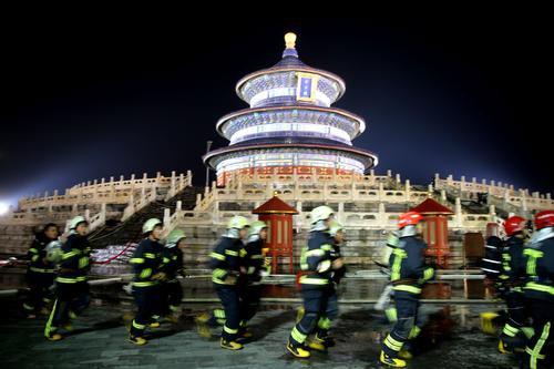 2019年9月6日晚,消防隊員從祈年殿四個方向架設(shè)移動水炮、消防機器人和云梯車對祈年殿起火部位進行撲救。當晚,北京東城消防支隊聯(lián)合天壇公園舉辦了文物古建應(yīng)急救援綜合演練。此次演練,包括人員疏散、搶救文物、滅火救援等突發(fā)事件的處置,歷時約40分鐘。