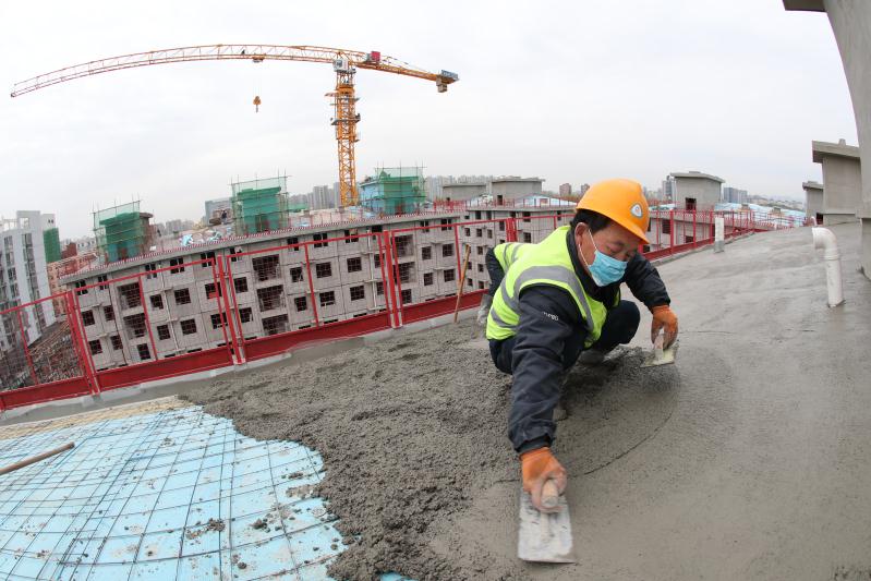 4月8日拍攝的幾名中鐵二十二局集團雄安公司工人正在北京“中國鐵建·玉景陽光”共有產(chǎn)權(quán)房房頂進行混凝土澆筑作業(yè)。攝影:孔祥文