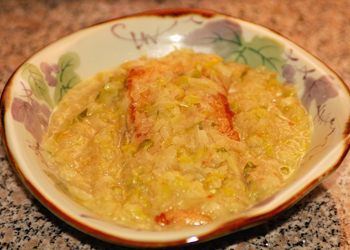 2、鍋里放少量水,加入1/5蟹肉,用適量黃酒、鹽、醋調(diào)味,煮沸后用生粉勾芡(要稀一點(diǎn)哦)。備用。