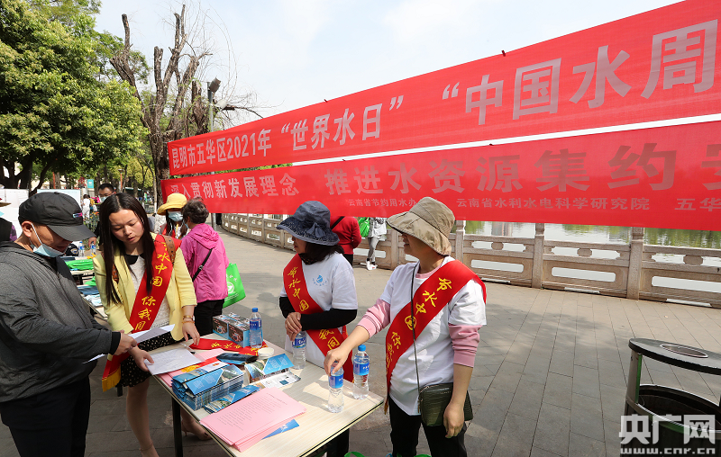 2021年3月20日,昆明開展“世界水日”“中國水周”宣傳活動(dòng)。在翠湖公園“宣傳現(xiàn)場(chǎng),節(jié)水宣傳志愿者為市民開展“節(jié)約用水、珍惜資源”科普宣傳服務(wù)(央廣網(wǎng)發(fā) 圖片來源:CFP)