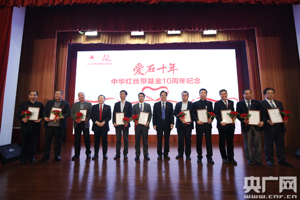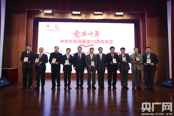 2015年11月30日,在第28個世界艾滋病日來臨前夕,中華紅絲帶基金“愛在十年”十周年紀念活動在京舉行,向全社會發(fā)布紅絲帶10年來防艾工作成果,并向為防艾工作做出貢獻的愛心人士、基層工作機構(gòu)頒發(fā)“紅絲帶十年獎”,并向為艾滋病防控做出突出貢獻的愛心企業(yè)家、社會力量、公眾人士、感染者代表頒發(fā)第四屆“感動紅絲帶獎”。全國工商聯(lián)名譽主席、中華紅絲帶基金名譽理事長黃孟復(fù),國家衛(wèi)計委副主任、國家中醫(yī)藥管理局局長、國務(wù)院防治艾滋病工作委員會辦公室主任王國強,世界衛(wèi)生組織駐華代表施賀德,全國工商聯(lián)副主席、中華紅絲帶基金理事長謝經(jīng)榮,中國人民對外友好協(xié)會副會長謝元,全國政協(xié)經(jīng)濟委員會副主任、世茂集團董事局主席、基金執(zhí)行理事長許榮茂,全國工商聯(lián)副主席、漢能控股集團董事局主席、基金副理事長李河君,原衛(wèi)生部副部長、基金副理事長彭玉,全國工商聯(lián)原常務(wù)副主席孫安民,全國工商聯(lián)原副主席張龍之,全國工商聯(lián)原副主席、基金監(jiān)事長瞿懷明,全國工商聯(lián)原副主席張元龍,國務(wù)院參事、中國光彩事業(yè)基金會理事長謝伯陽以及基金形象大使白巖松,預(yù)防艾滋病宣傳員、中央電視臺主持人周濤,基金涼山項目關(guān)愛大使、中央電視臺主持人沙瑪阿果,表演藝術(shù)家侯耀華等領(lǐng)導(dǎo)和嘉賓出席此次活動。