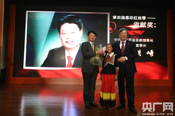 活動上還頒發(fā)了第四屆“感動紅絲帶”獎。中國民生銀行董事長洪崎榮獲“感動紅絲帶---貢獻獎”,他領(lǐng)導(dǎo)的中國民生銀行全體干部職工積極參與防艾工作,著力解決受艾滋病影響貧困落后地區(qū)的教育、醫(yī)療衛(wèi)生困難,2015年9月,其捐建的涼山州美姑縣民生銀行紅絲帶愛心學(xué)校正式竣工,首批接納了當?shù)?00名特殊困難兒童入學(xué);沙瑪阿果榮獲“感動紅絲帶---愛心獎”,自2010年加入紅絲帶事業(yè)以來,她便為推動大涼山防艾事業(yè)四處奔走,發(fā)揮自身影響力為紅絲帶工作宣傳、籌款,牽頭打造追蹤艾滋病母嬰阻斷過程的紀錄片,感動了眾多社會愛心人士;湖北省隨州市電力公司“紅絲帶黨員服務(wù)隊”榮獲“感動紅絲帶---溫暖獎”,在2001年國人對艾滋病“談艾色變”的時候,均川鎮(zhèn)供電所的17名共產(chǎn)黨員毅然決定留守艾滋病疫情最重的鄉(xiāng)村,為他們進行電網(wǎng)改造,幫助他們克服困難,如今紅絲帶黨員服務(wù)隊的規(guī)模已經(jīng)擴大到800人,他們十四年如一日的幫助受艾滋病影響家庭,提高他們的生產(chǎn)生活水平,資助感染者家庭培養(yǎng)出了4名大學(xué)生,幫助20多名艾滋孤兒完成了初中、高中等學(xué)業(yè),資助了100多個艾滋病家庭50余萬元;彩虹中國創(chuàng)始人張錦雄榮獲“感動紅絲帶---自強獎”,他在20歲時候發(fā)現(xiàn)感染了艾滋病,迄今為止已與艾共生20年,他自信、樂觀,主動公開自己的感染身份,并從1997年開始在艾滋病防治機構(gòu)做義工,2008創(chuàng)辦獨立的公益組織,迄今在全國40多個地區(qū)的60多所高校舉辦一百多場公益講座。